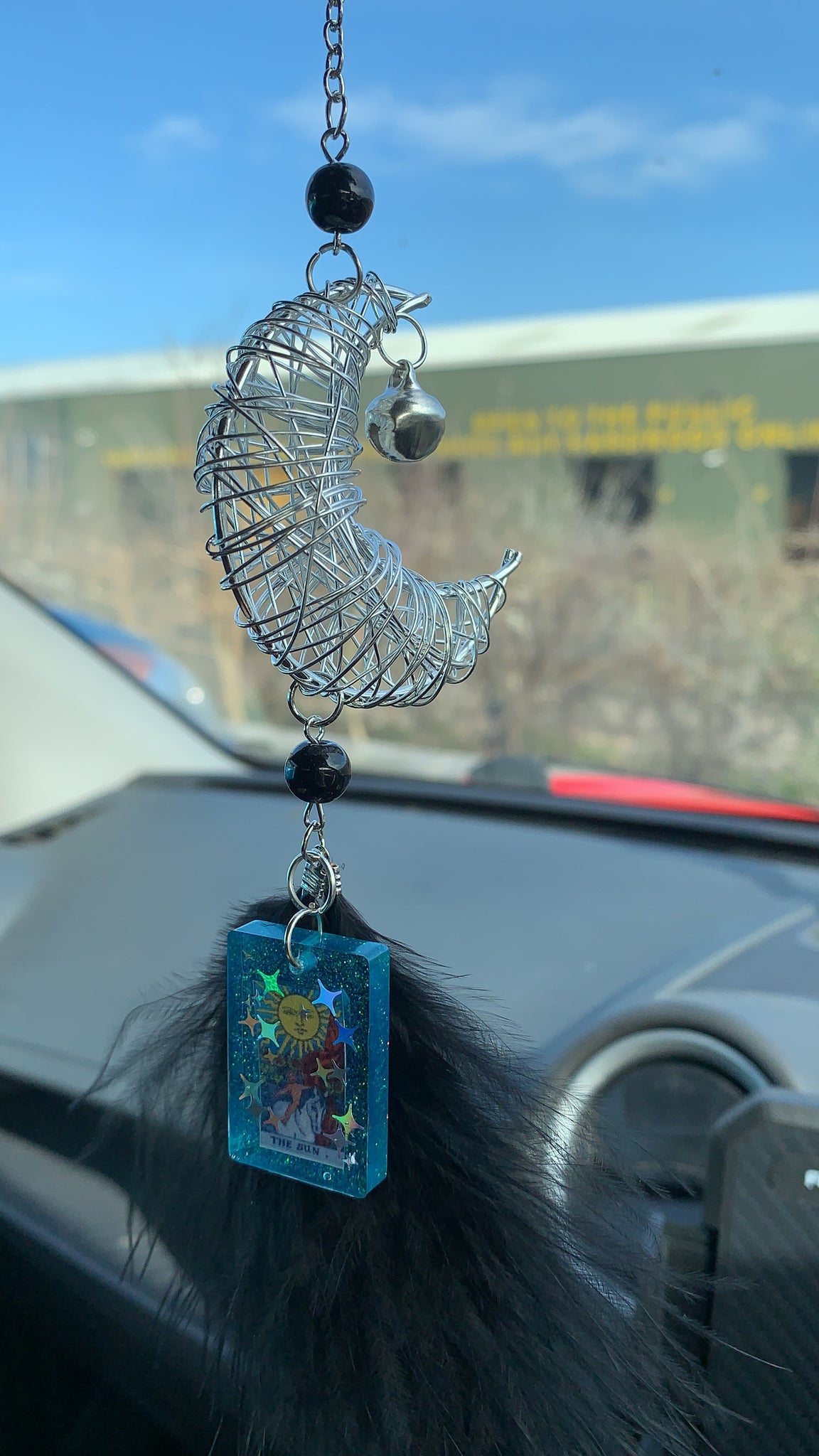 Here is my wired moon car charm with a hand poured tarot card on a black feather.